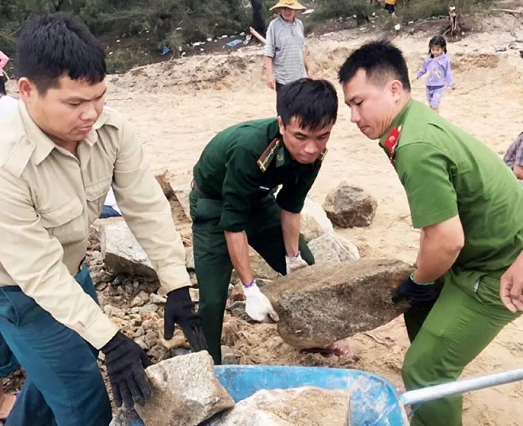 Công an xã Phú Thuận (huyện Phú Vang) cùng bộ đội biên phòng, dân quân giúp người dân gia cố kè biển sạt lở